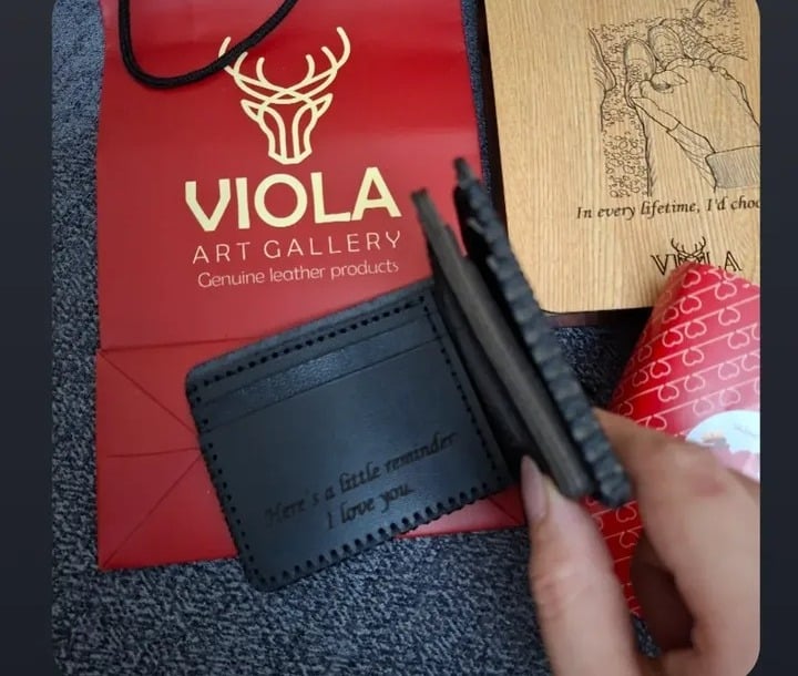 الماتريال بتاع الجلد والتقفيل بتاع المحفظة والباكدج والخط وكله كله حقيقي مبسوطة اوي، شكرا ليكم 🤍